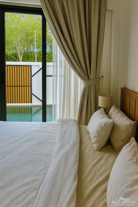 Looking for a Krabi villa with 3 bedrooms near the beach? Blue Horizon Villa offers three spacious, air-conditioned bedrooms – perfect for families, couples, or groups. Each room includes a comfortable bed, fresh linens, storage space, and a quiet atmosphere for a great night’s sleep. Whether you're searching for a Krabi family villa Ao Nang, room with AC in Krabi, or a Thailand villa for friends, this space is designed for rest and relaxation after your beach days and island trips.